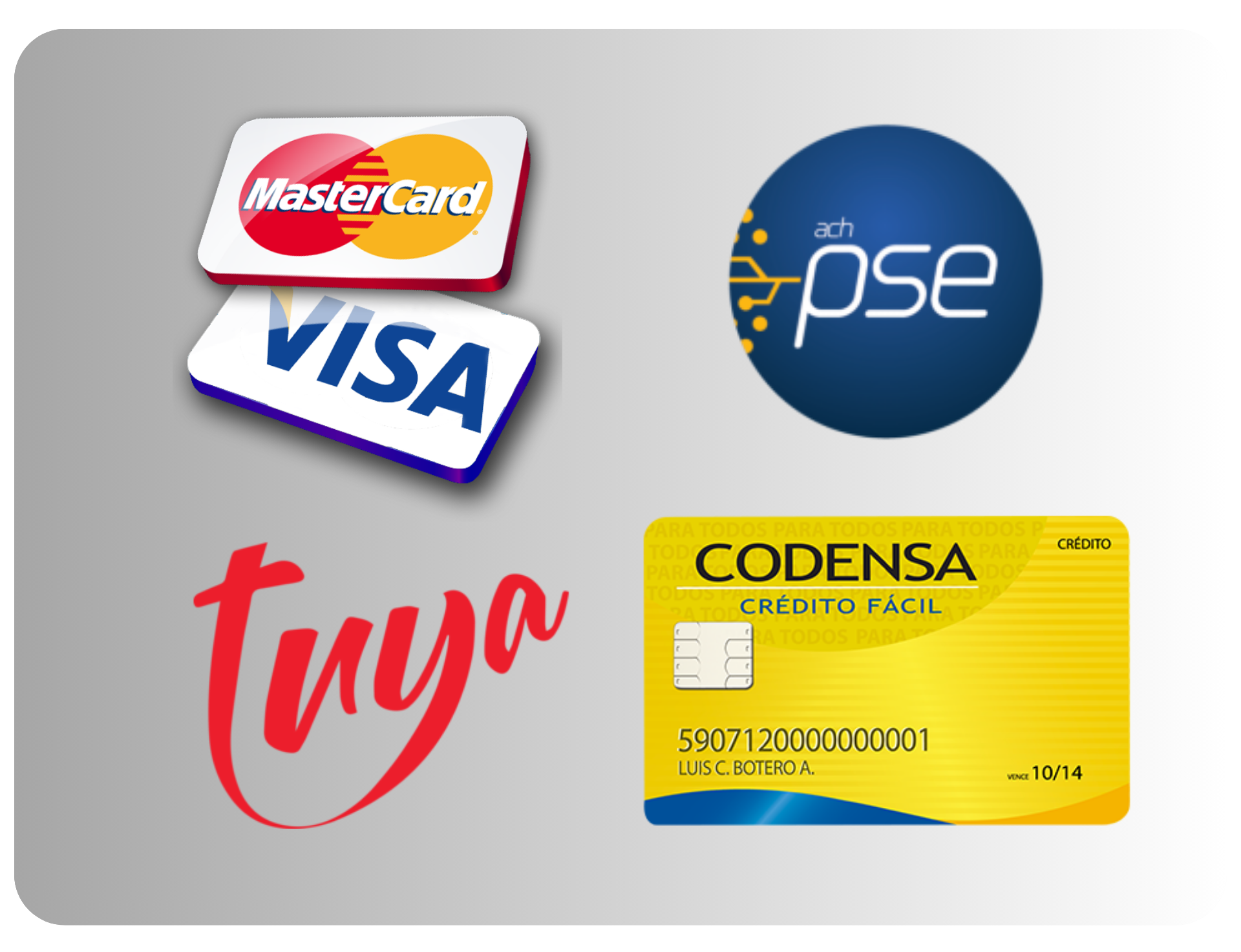 Paga con cualquier tarjeta de crédito, débito PSE, tarjeta Codensa o tarjeta Tuya (Éxito/Alkosto)